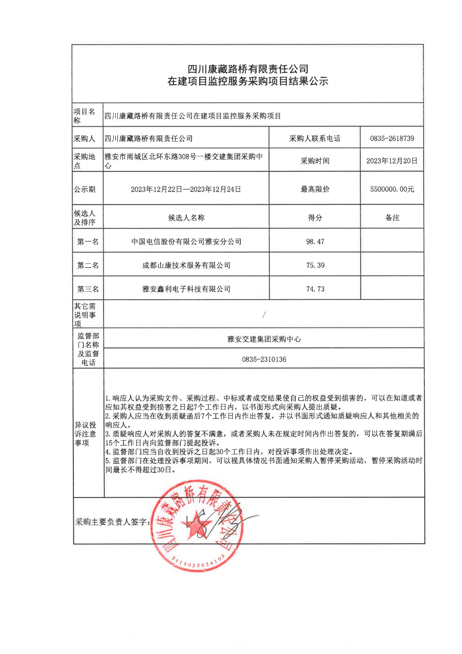 四川康藏路橋有限責(zé)任公司在建項目監(jiān)控服務(wù)采購項目結(jié)果公示