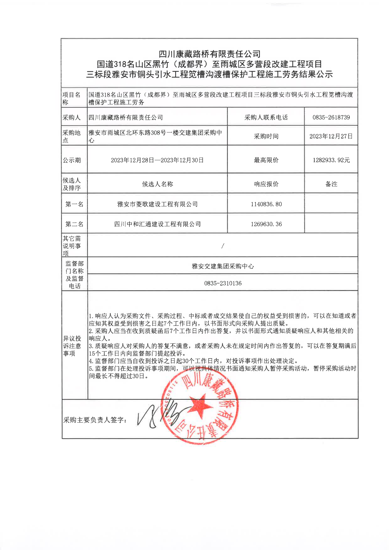 四川康藏路橋有限責(zé)任公司國道318名山區(qū)黑竹(成都界)至雨城區(qū)多營段改建工程項目三標段雅安市銅頭引水工程筧槽溝渡槽保護工程施工勞務(wù)結(jié)果公示