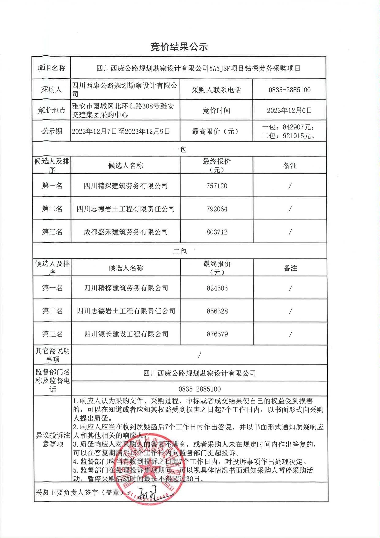 四川西康公路規(guī)劃勘察設(shè)計公司YAYJSP項目鉆探勞務(wù)采購項目競價結(jié)果公示