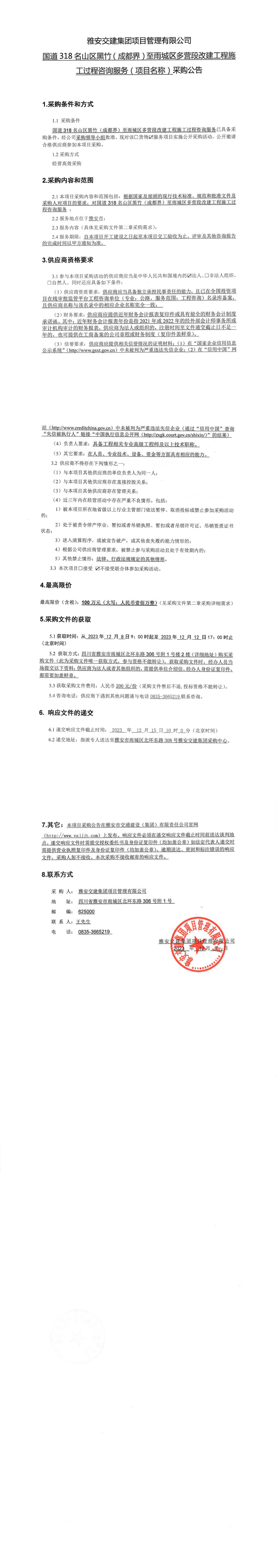 雅安交建集團(tuán)項目管理有限公司國道318名山區(qū)黑竹(成都界)至雨城區(qū)多營段改建工程施工過程咨詢服務(wù)(項目名稱)采購公告