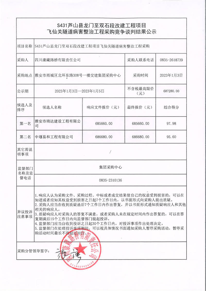 四川康藏路橋有限責(zé)任公司S431蘆山縣龍門(mén)至雙石段改建工程項(xiàng)目飛仙關(guān)隧道病害整治工程采購(gòu)競(jìng)爭(zhēng)談判結(jié)果公示