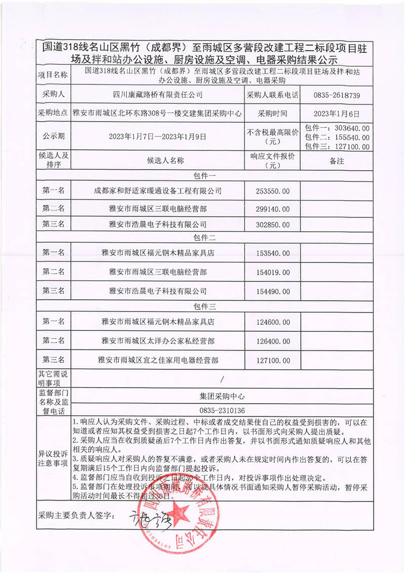 四川康藏路橋有限責(zé)任公司國道318線名山區(qū)黑竹(成都界)至雨城區(qū)多營段改建工程二標(biāo)段項(xiàng)目駐場及拌和站辦公設(shè)施、廚房設(shè)施及空調(diào)、電器采購結(jié)果公示