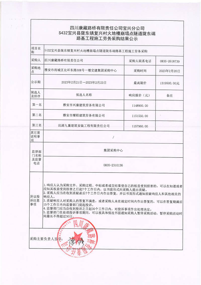 四川康藏路橋有限責任公司寶興分公司S432寶興縣隴東鎮(zhèn)復興村火地槽崩塌點隧道隴東端路基工程施工勞務(wù)采購結(jié)果公示