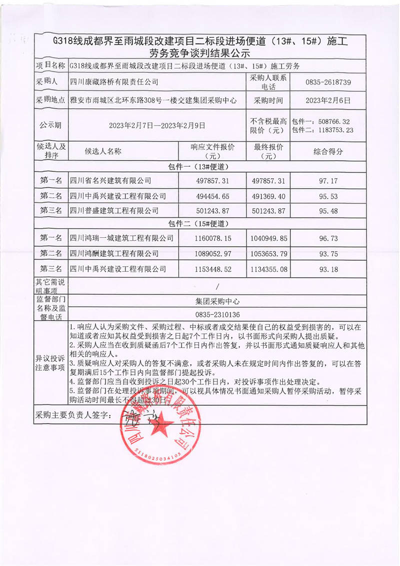 四川康藏路橋有限責(zé)任公司G318線(xiàn)成都界至雨城段改建項(xiàng)目二標(biāo)段進(jìn)場(chǎng)便道(13#、15#)施工勞務(wù)競(jìng)爭(zhēng)談判結(jié)果公示