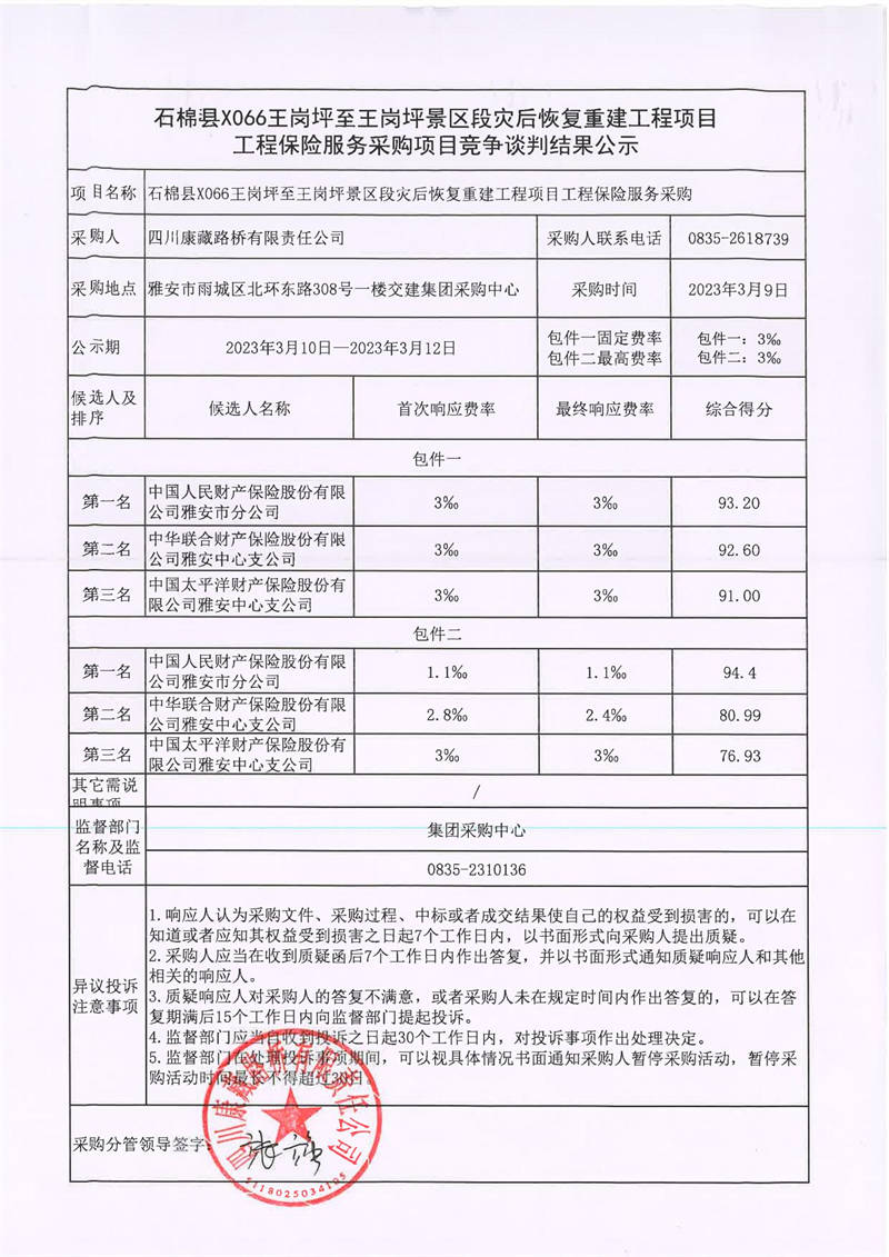 四川康藏路橋有限責任公司石棉縣X066王崗坪至王崗坪景區(qū)段災后恢復重建工程項目工程保險服務采購競爭談判結果公示