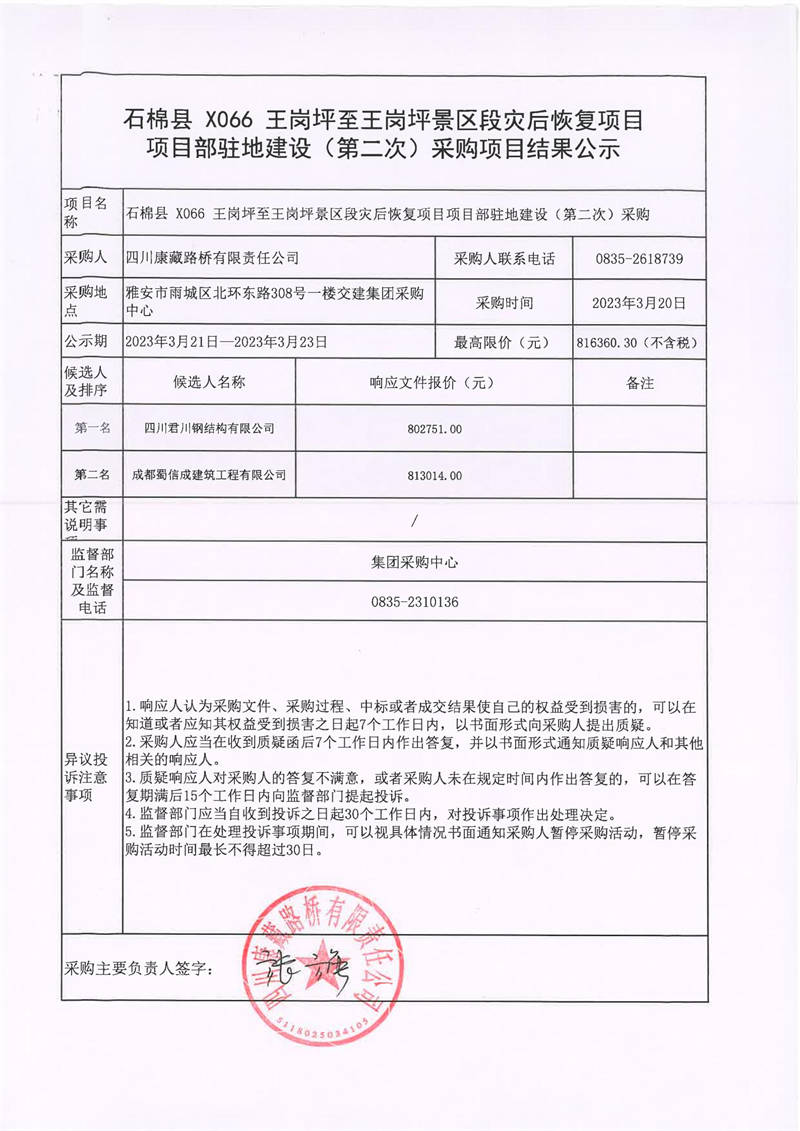 四川康藏路橋有限責任公司石棉縣X066王崗坪至王崗坪景區(qū)段災后恢項目項目駐地建設(shè)(第二次)采購結(jié)果公示