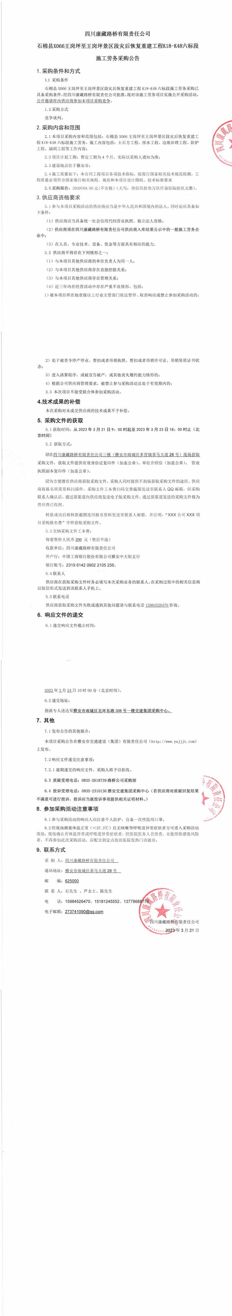 四川康藏路橋有限責任公司石棉縣X066王崗坪至王崗坪景區(qū)段災(zāi)后恢復(fù)重建工程K18-K48六標段施工勞務(wù)采購公告