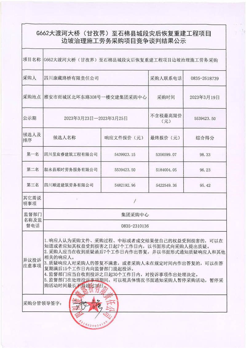 四川康藏路橋有限責(zé)任公司G662大渡河大橋(甘孜界)至石棉縣城段災(zāi)后恢復(fù)重建工程項(xiàng)目邊坡治理施工勞務(wù)采購項(xiàng)目競爭談判結(jié)果公示