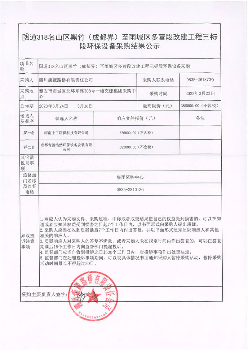 四川康藏路橋有限責任公司國道318名山區(qū)黑竹(成都界)至雨城區(qū)多營段改建工程三標段環(huán)保設(shè)備采購結(jié)果公示