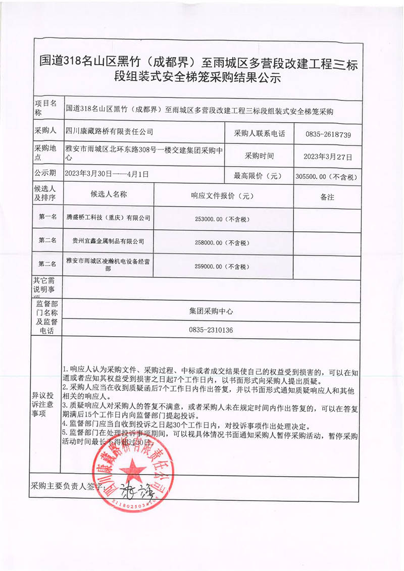 四川康藏路橋有限責(zé)任公司國(guó)道318名山區(qū)黑竹(成都界)至雨城區(qū)多營(yíng)段改建工程三標(biāo)段組裝式安全梯籠采購結(jié)果公示