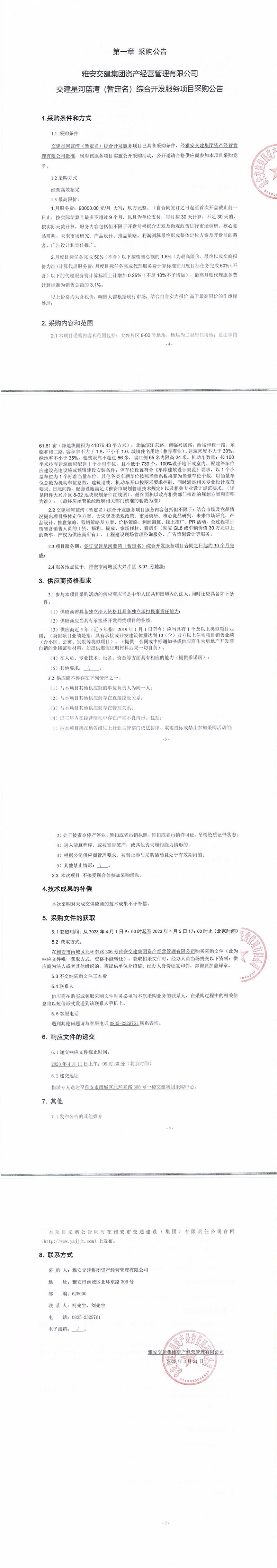 雅安交建集團資產(chǎn)經(jīng)營管理有限公司交建星河藍灣(暫定名)綜合開發(fā)服務項目采購公告