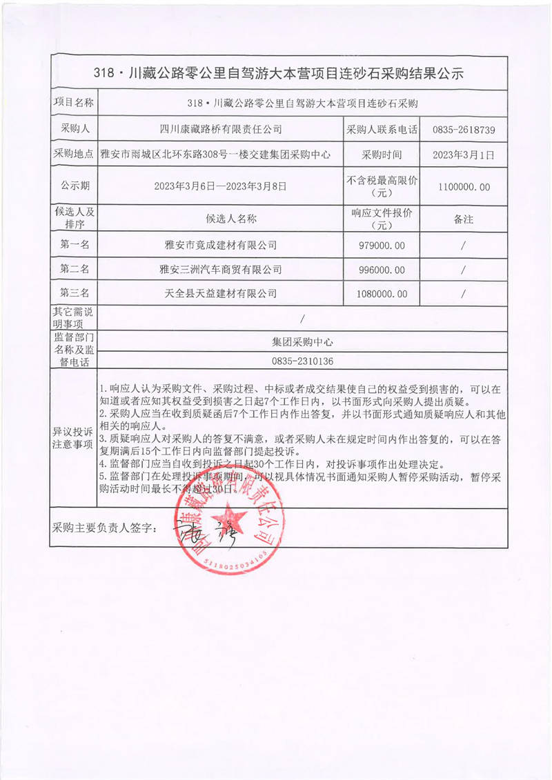 四川康藏路橋有限責任公司318·川藏公路零公里自駕游大本營項目連砂石采購結果公示