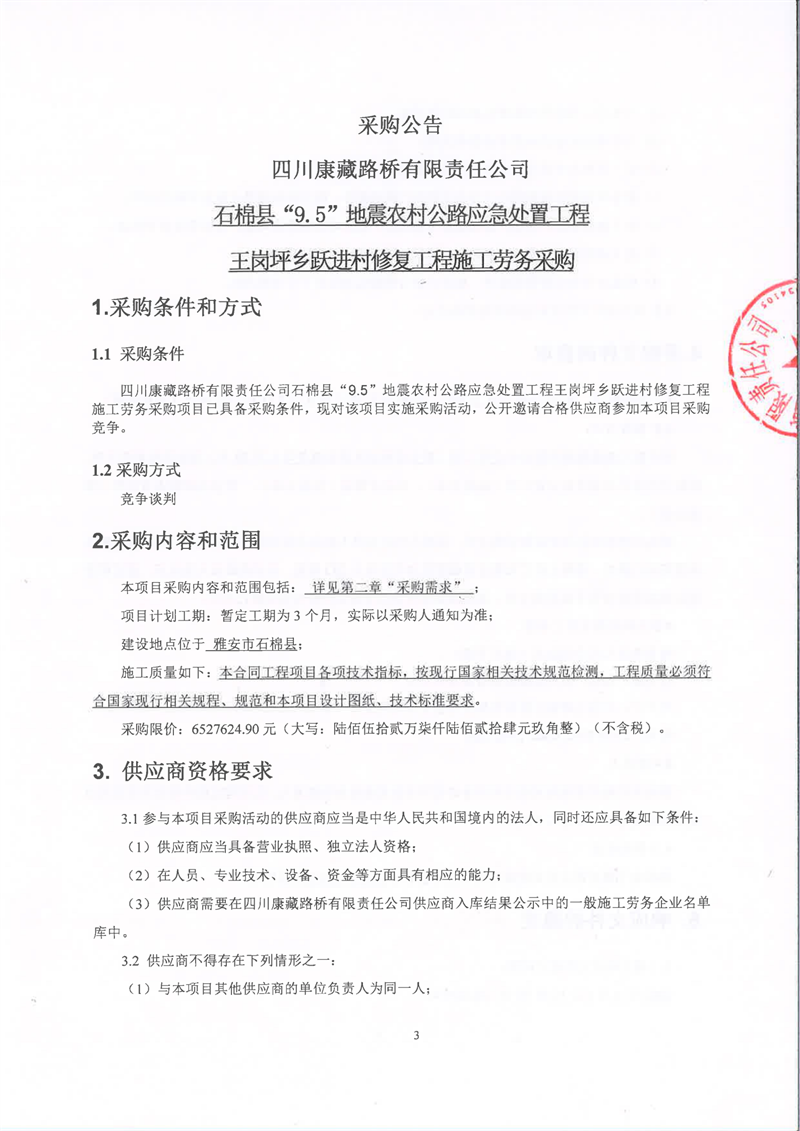 四川康藏路橋有限責(zé)任公司石棉縣“9.5”地震農(nóng)村公路應(yīng)急處置工程王崗坪鄉(xiāng)躍進村修復(fù)工程施工勞務(wù)采購公告