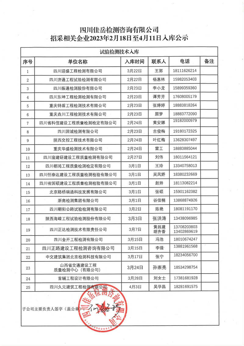 四川佳岳檢測(cè)咨詢(xún)有限公司(試驗(yàn)檢測(cè)勞務(wù)供應(yīng)商庫(kù))2023年2月18日至4月11日入庫(kù)結(jié)果公示