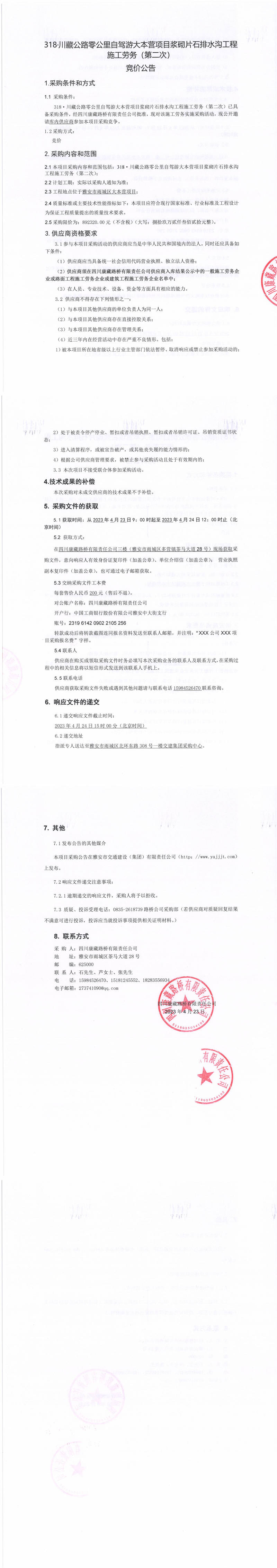 四川康藏路橋有限責任公司G318線成都至雨城段改建項目二標段進場便道(6#、7#、16#、18#)土石方及防護、排水工程施工勞務(wù)流標通知