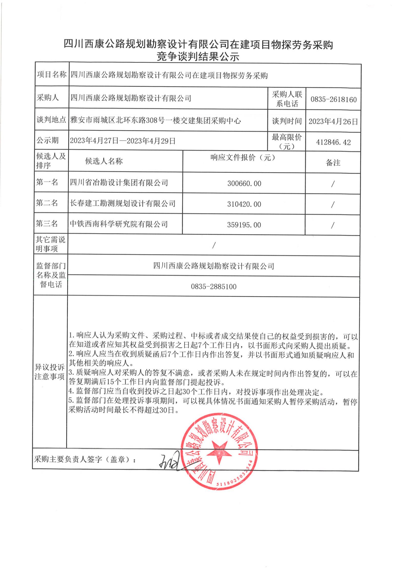四川西康公路規(guī)劃勘察設(shè)計(jì)有限公司在建項(xiàng)目物探勞務(wù)采購(gòu)競(jìng)爭(zhēng)談判結(jié)果公示