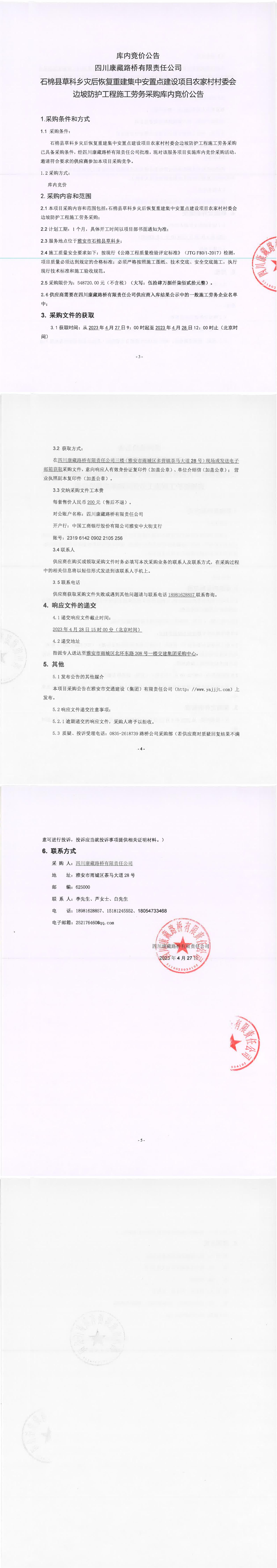 四川康藏路橋有限責任公司石棉草科鄉(xiāng)災后恢復重建集中安置點建設(shè)項目農(nóng)家村村委會邊坡防護工程施工勞務(wù)采購采購庫內(nèi)競價公告