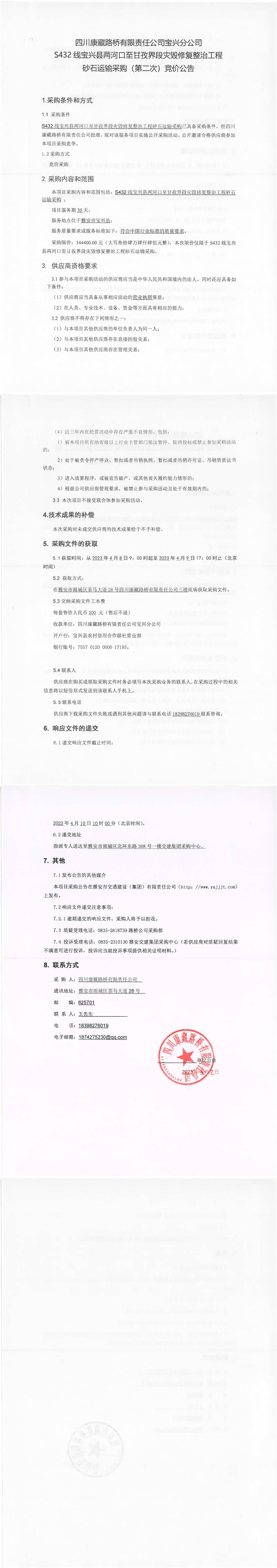四川康藏路橋有限責(zé)任公司寶興分公司S432寶興縣兩河口至甘孜界段災(zāi)毀修復(fù)整治工程砂石運(yùn)輸采購(gòu)(第二次)競(jìng)價(jià)公告