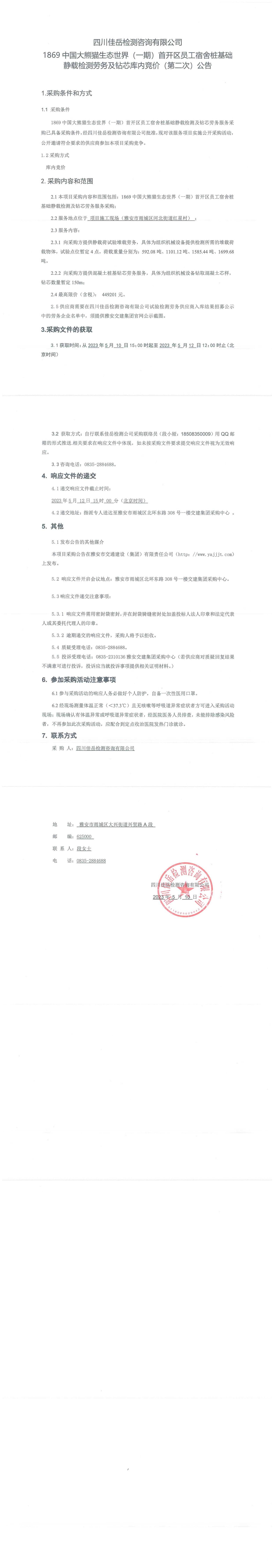 四川佳岳檢測咨詢有限公司1869中國大熊貓生態(tài)世界(一期)首開區(qū)員工宿舍樁基礎靜載檢測勞務及磚芯庫內競價(第二次)采購公告