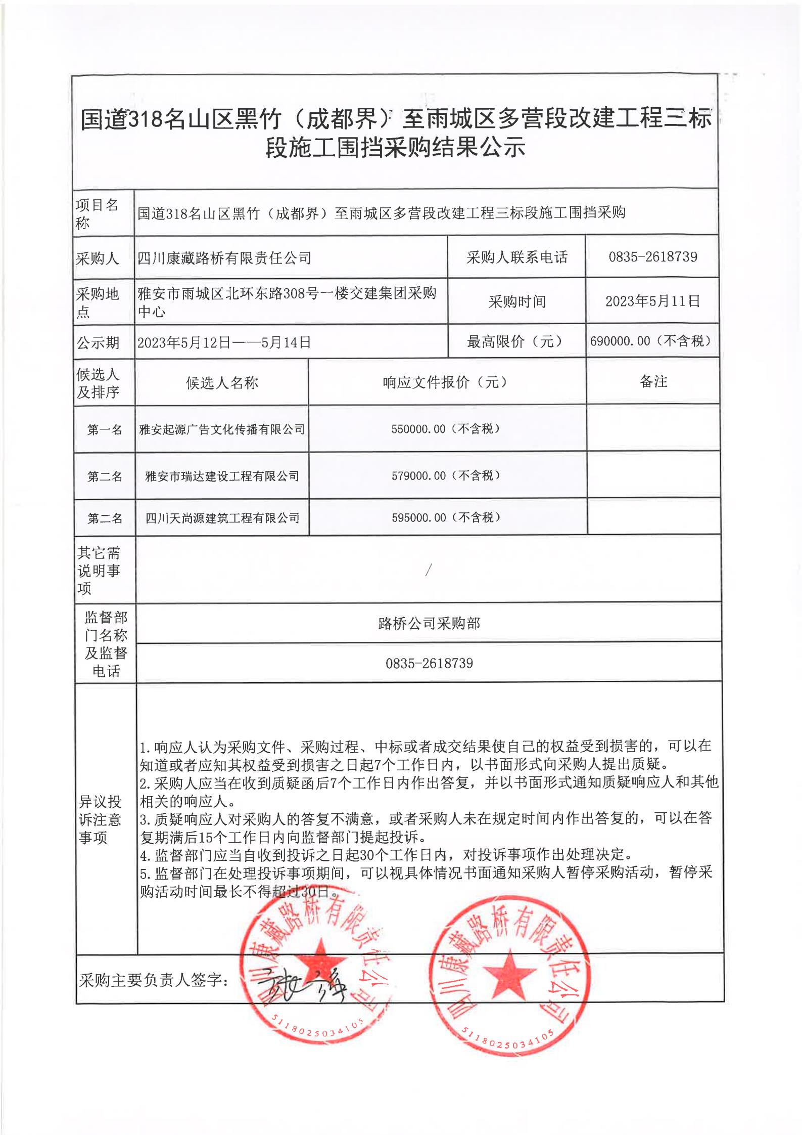 四川康藏路橋有限責(zé)任公司國(guó)道318名山區(qū)黑竹(成都界)至雨城區(qū)多營(yíng)段改建工程三標(biāo)段施工圍擋采購結(jié)果公示