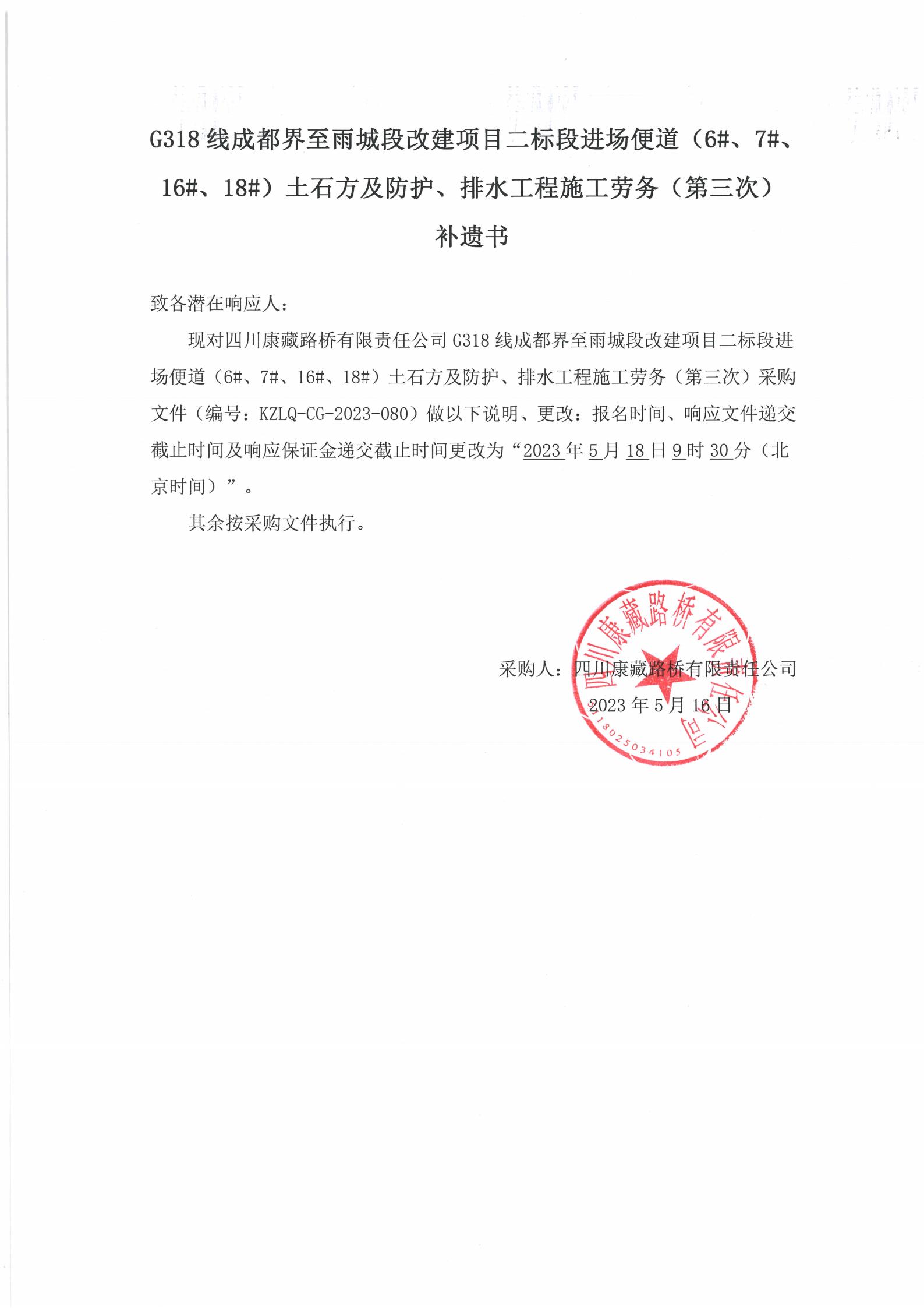 四川康藏路橋有限責(zé)任公司G318線成都至雨城段改建項目二標段進場便道(6#、7#、16#、18#)土石方及防護、排水工程施工勞務(wù)(第三次)補遺書