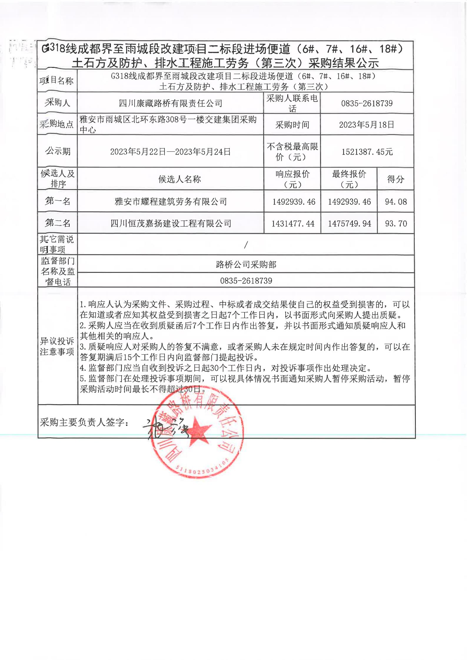 四川康藏路橋有限責(zé)任公司G318線成都至雨城段改建項目二標(biāo)段進(jìn)場便道(6#、7#、16#、18#)土石方及防護、排水工程施工勞務(wù)(第三次)采購結(jié)果公示