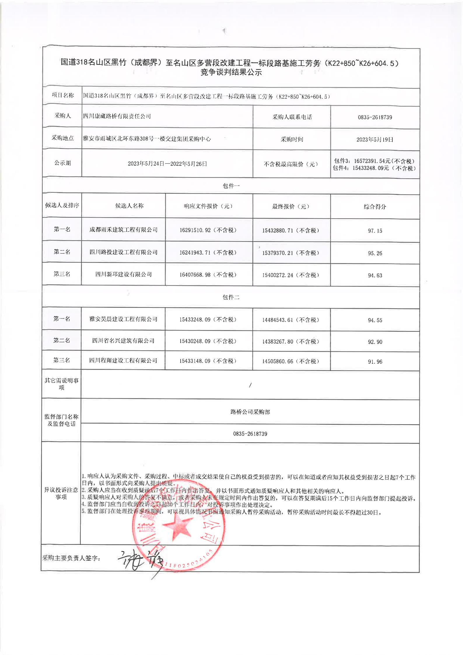 四川康藏路橋有限責(zé)任公司國(guó)道318名山區(qū)黑竹(成都界)至雨城區(qū)多營(yíng)段改建工程一標(biāo)段路基施工勞務(wù)(K16+900~K22+850)競(jìng)爭(zhēng)談判結(jié)果公示