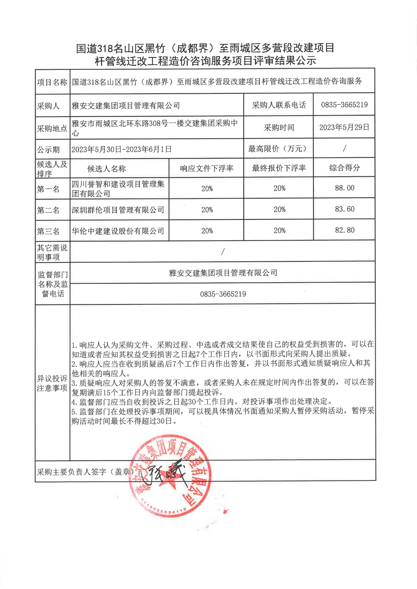 雅安交建集團(tuán)項(xiàng)目管理有限公司國(guó)道318名山區(qū)黑竹(成都界)至雨城區(qū)多營(yíng)段改建項(xiàng)目桿管線遷改工程造價(jià)咨詢服務(wù)項(xiàng)目評(píng)審結(jié)果公示