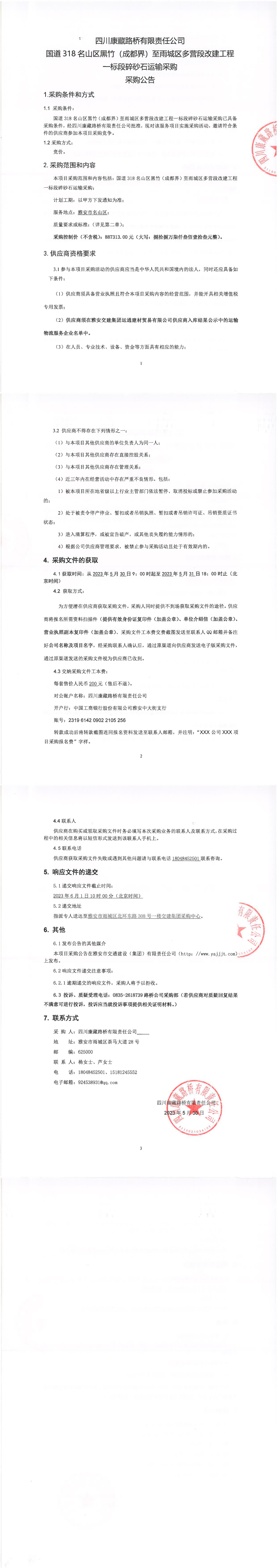 四川康藏路橋有限責(zé)任公司國道318名山區(qū)黑竹(成都界)至雨城區(qū)多營段改建工程一標(biāo)段碎砂石運輸采購公告