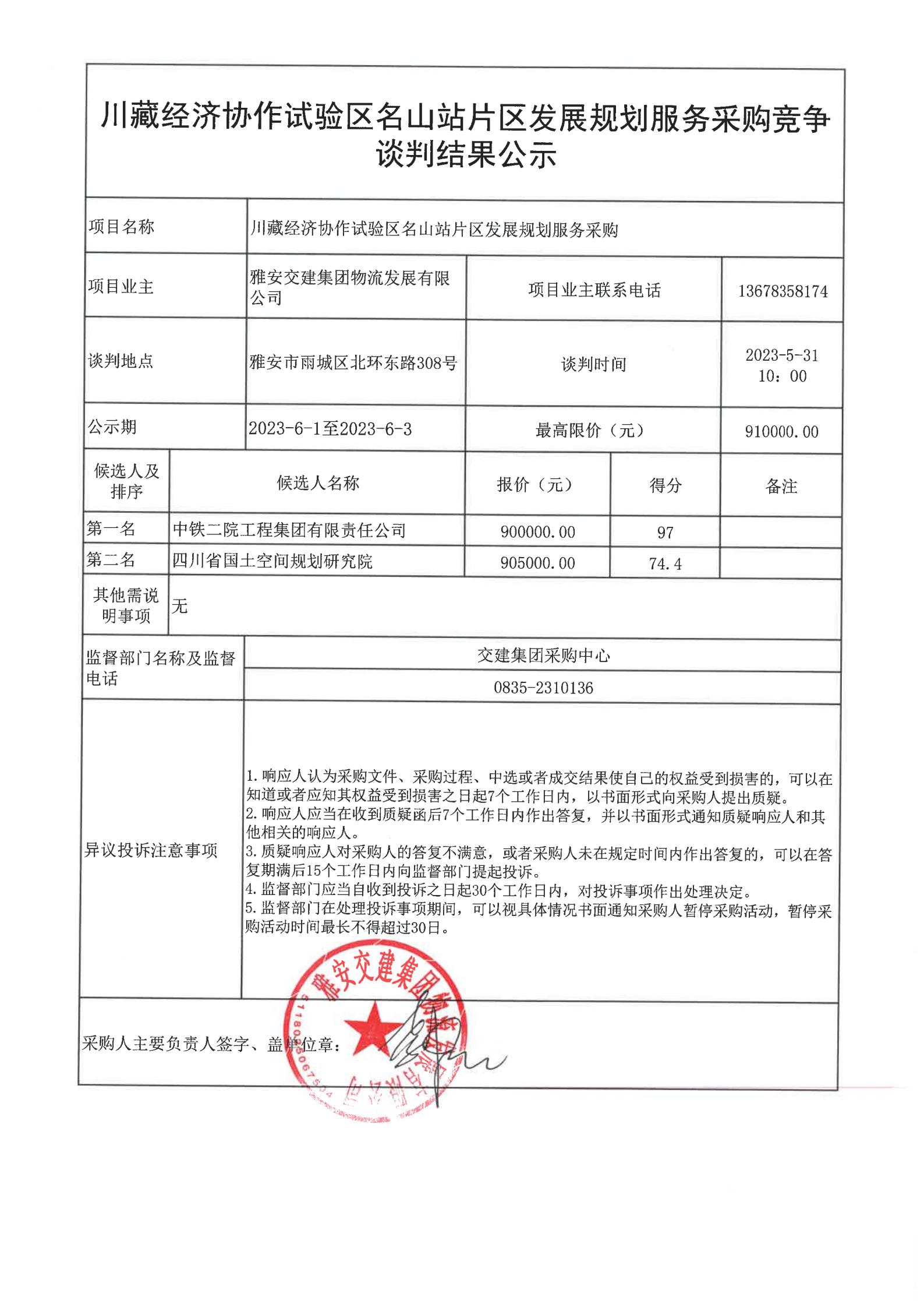 雅安交建集團物流發(fā)展有限公司川藏經(jīng)濟協(xié)作試驗區(qū)名山站片區(qū)發(fā)展規(guī)劃編制服務采購競爭談判結(jié)果公示