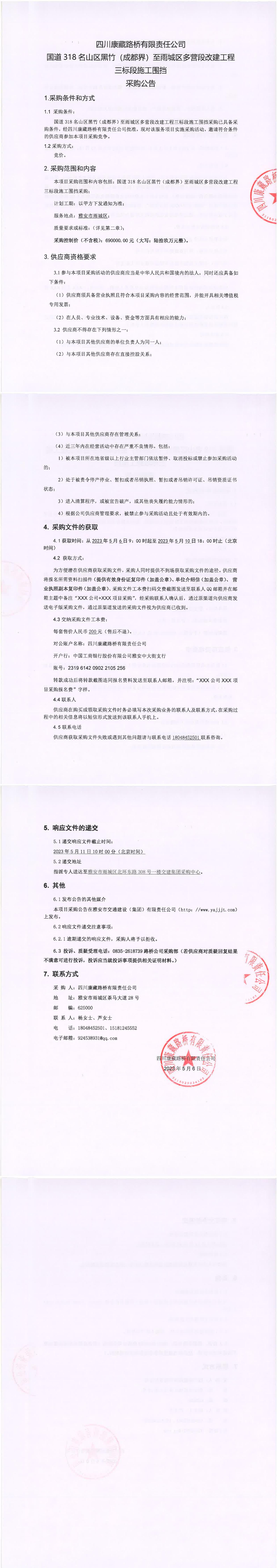 四川康藏路橋有限責(zé)任公司國(guó)道318名山區(qū)黑竹(成都界)至雨城區(qū)多營(yíng)段改建工程三標(biāo)段施工圍擋采購(gòu)公告