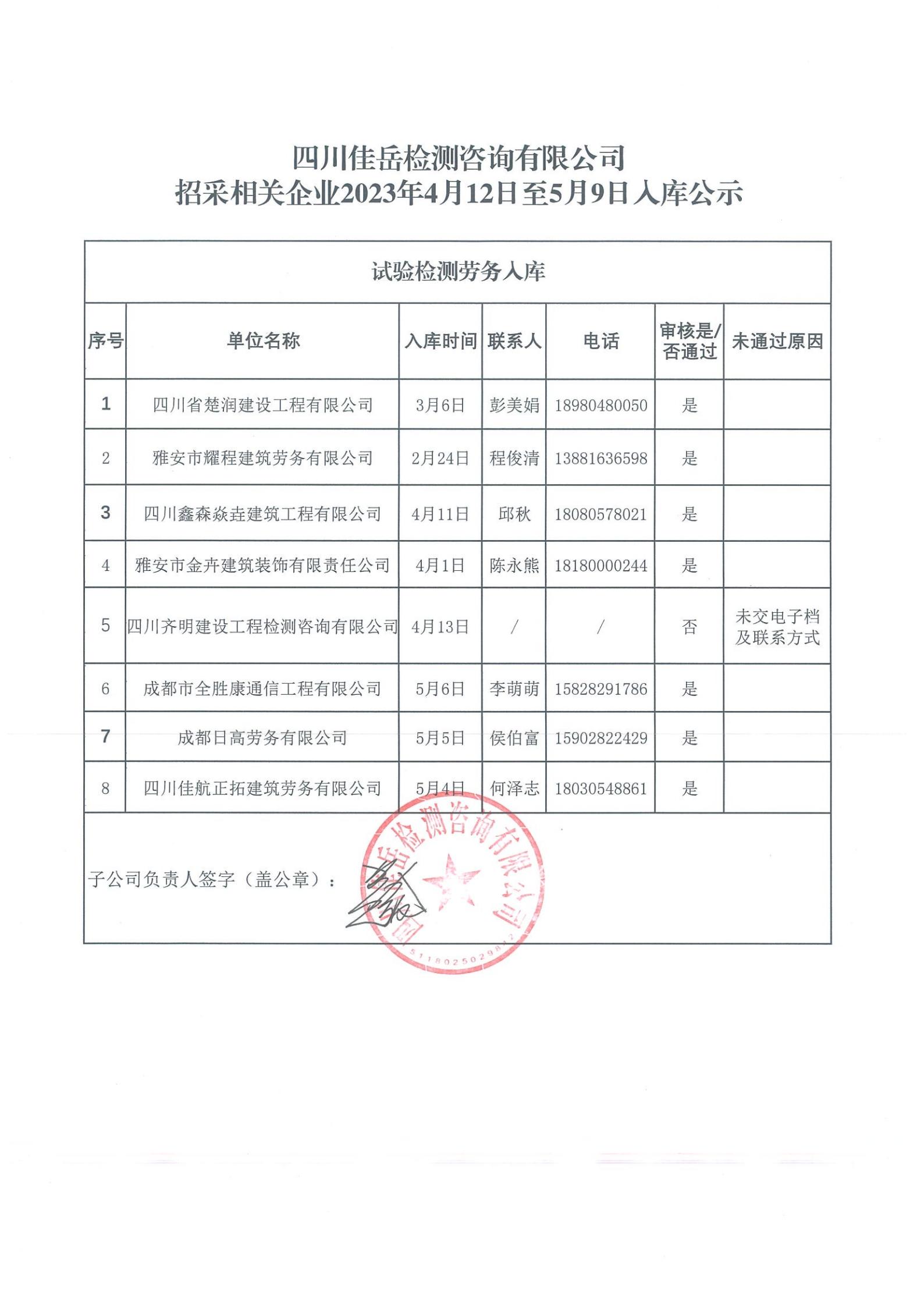 四川佳岳檢測咨詢有限公司(試驗檢測勞務(wù)供應(yīng)商庫)2023年4月12日至5月9日入庫結(jié)果公示