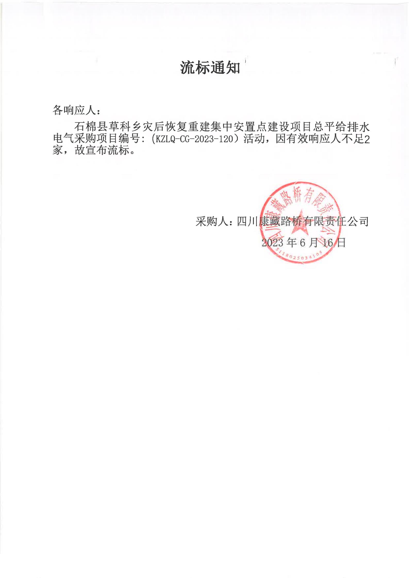 四川康藏路橋有限責(zé)任公司石棉縣草科鄉(xiāng)災(zāi)后恢復(fù)重建集中安置點建設(shè)項目總平給排水電氣采購流標(biāo)通知