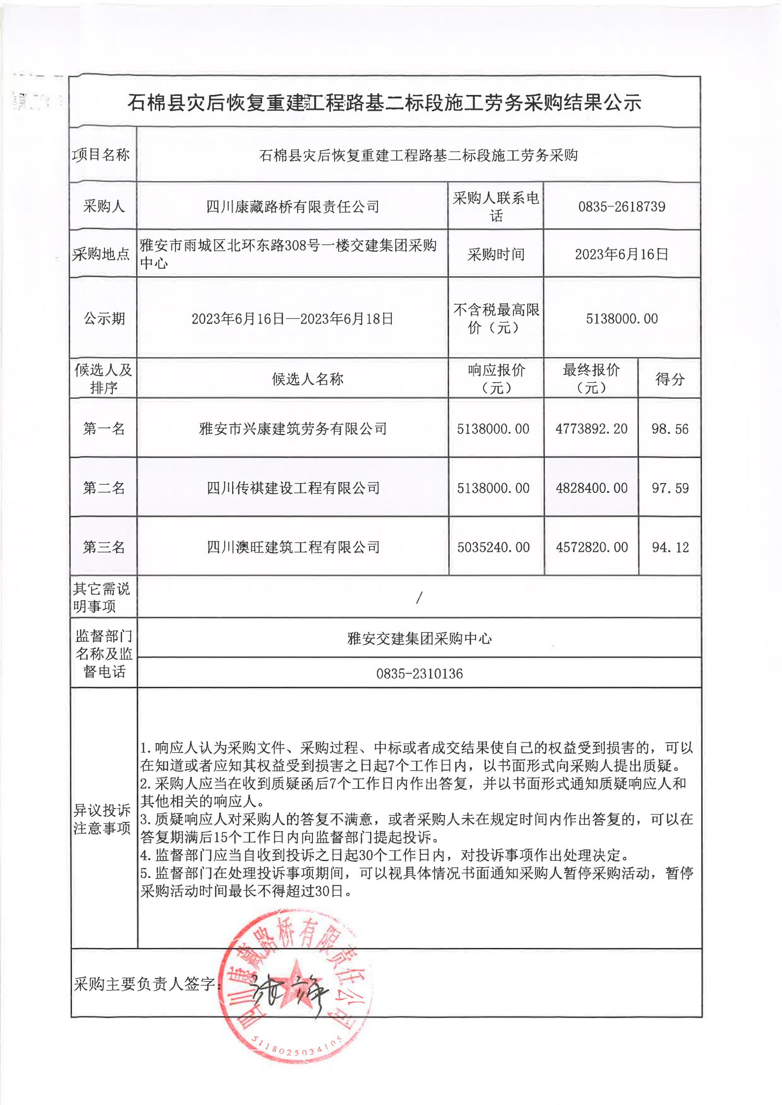 四川康藏路橋有限責任公司石棉縣災(zāi)后恢復(fù)重建工程路基二標段施工勞務(wù)采購結(jié)果公示