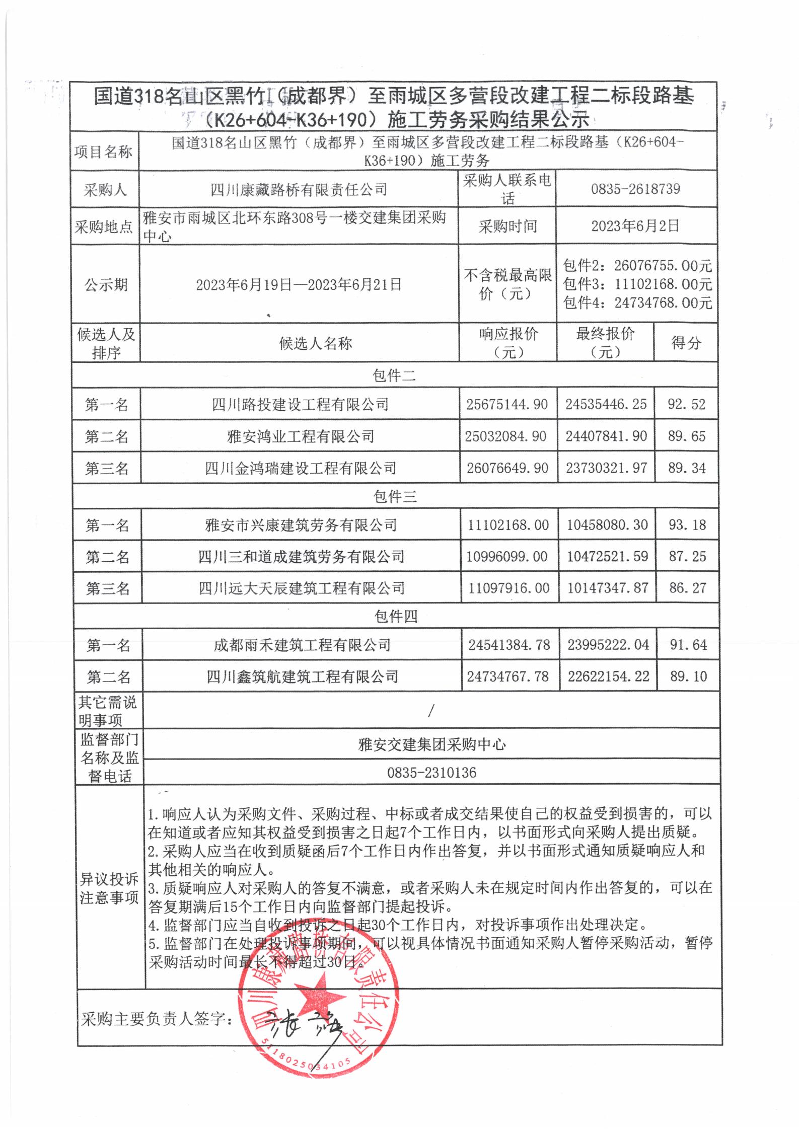四川康藏路橋有限責任公司國道318名山區(qū)黑竹(成都界)至雨城區(qū)多營段改建工程二標段路基(K26+604-K36+190)施工勞務采購(包件二、包件三、包件四)結(jié)果公示