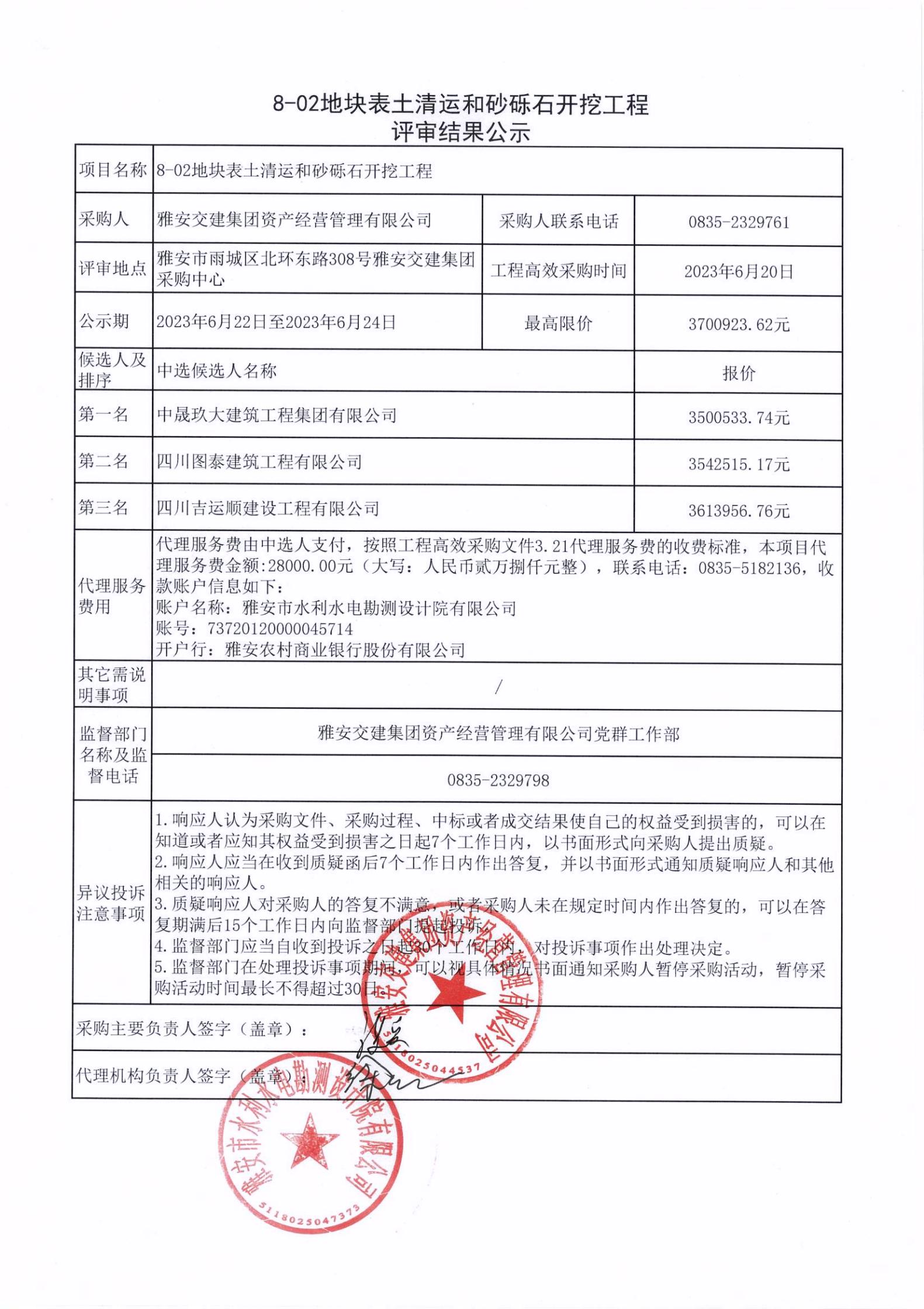 雅安交建集團(tuán)資產(chǎn)經(jīng)營(yíng)管理有限公司8-02地塊表土清運(yùn)和砂礫石開挖工程項(xiàng)目評(píng)審結(jié)果公示