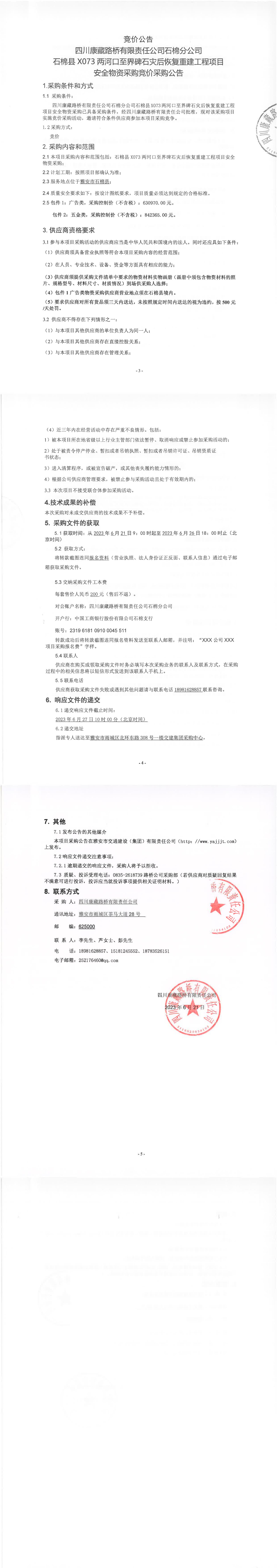 四川康藏路橋有限責任公司石棉分公司石棉縣X073兩河口至界碑石災后恢復重建工程項目安全物資采購競價公告