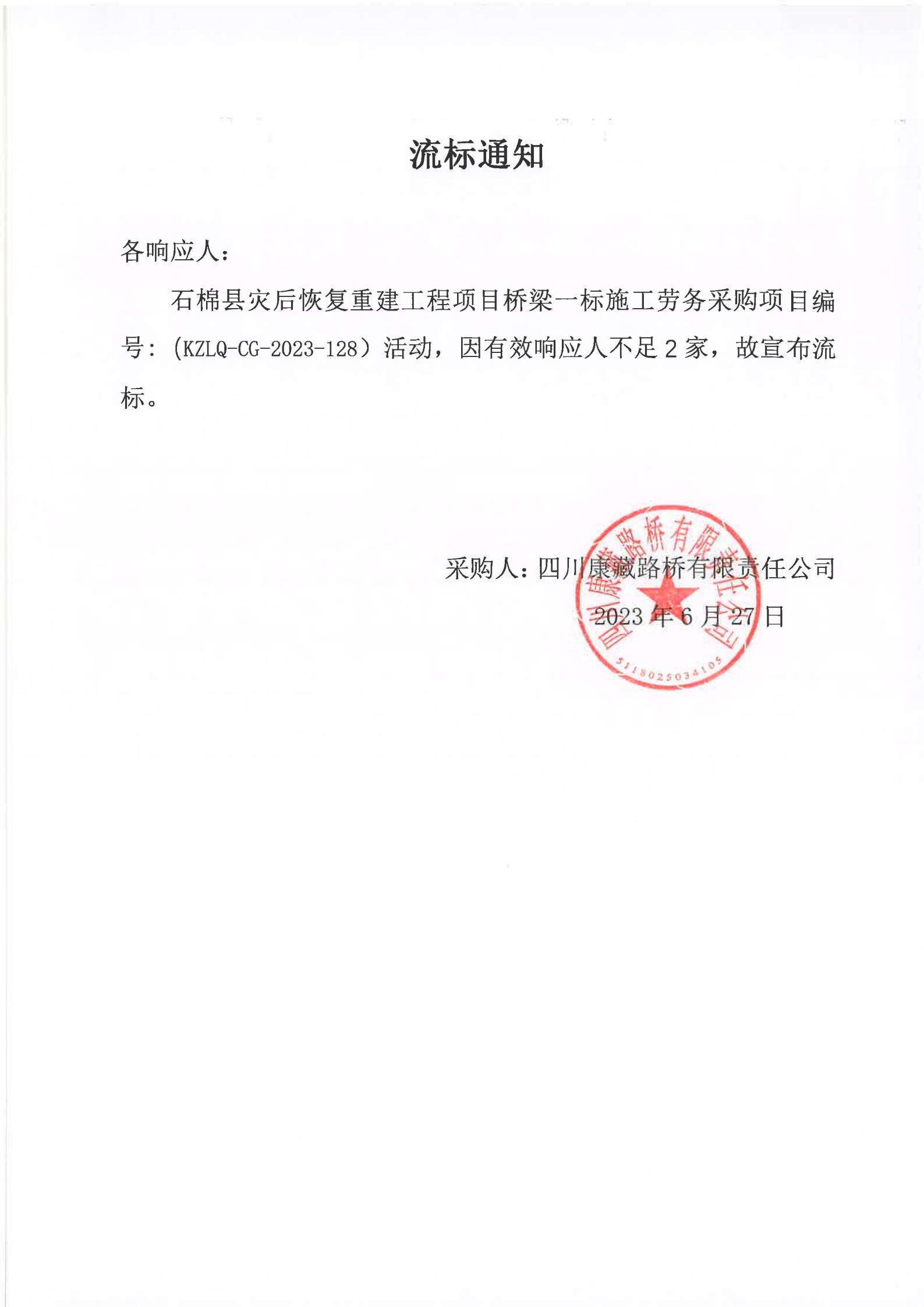 四川康藏路橋有限責任公司石棉縣災(zāi)后恢復重建工程項目橋梁一標施工勞務(wù)采購流標通知