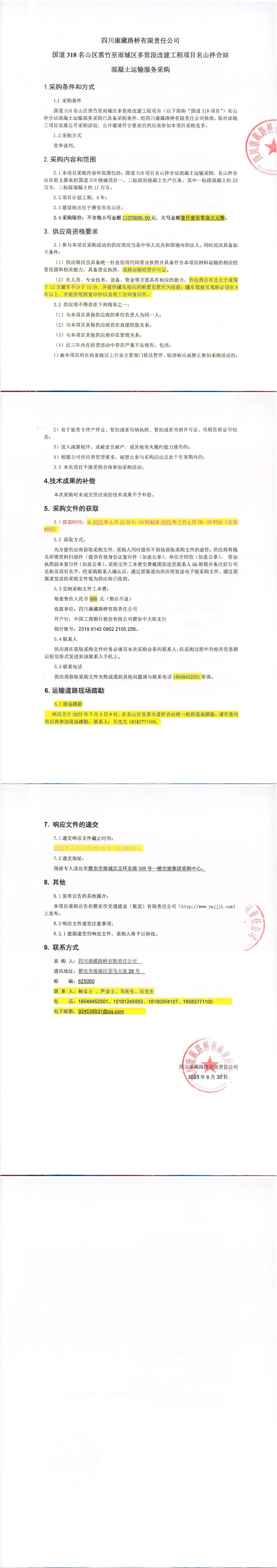 四川康藏路橋有限責(zé)任公司國(guó)道318名山區(qū)黑竹至雨城區(qū)多營(yíng)段改建工程項(xiàng)目名山拌合站混凝土運(yùn)輸服務(wù)采購(gòu)