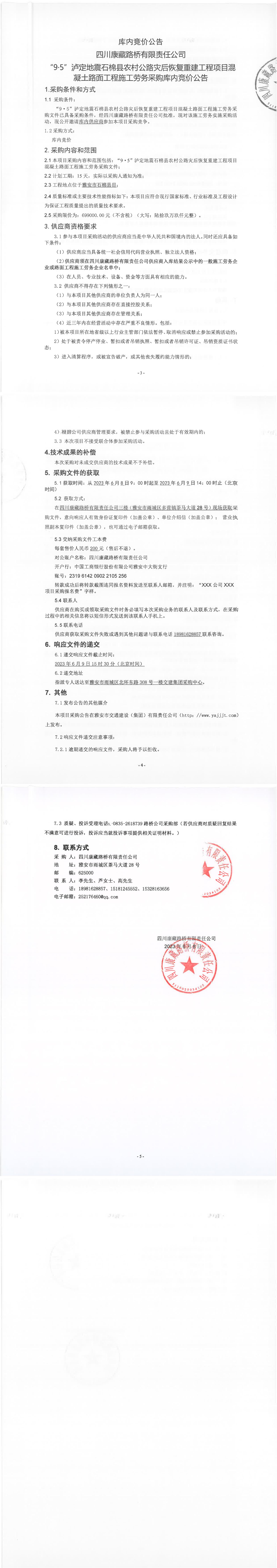 四川康藏路橋有限責任公司“9·5”瀘定地震石棉縣農(nóng)村公路災后恢復重建工程項目混凝土路面工程施工勞務(wù)采購庫內(nèi)競價公告