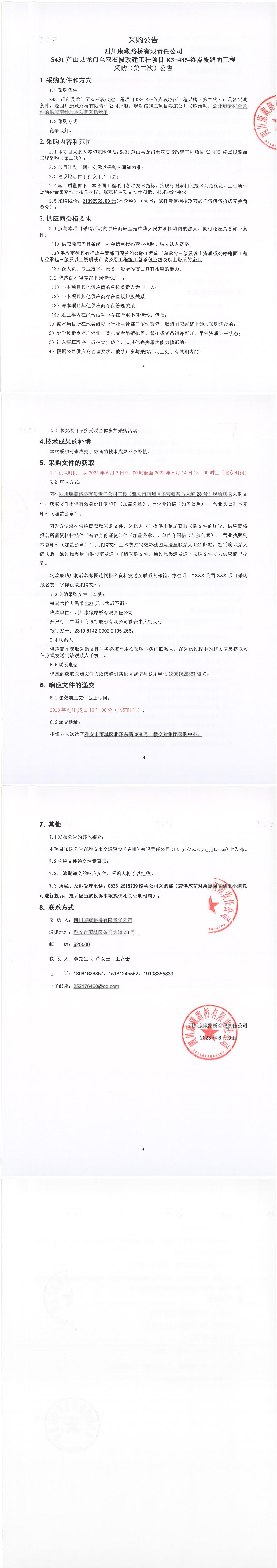 四川康藏路橋有限責(zé)任公司S431蘆山縣龍門至雙石段改建工程項(xiàng)目K3+485-終點(diǎn)段路面工程采購(第二次)公告