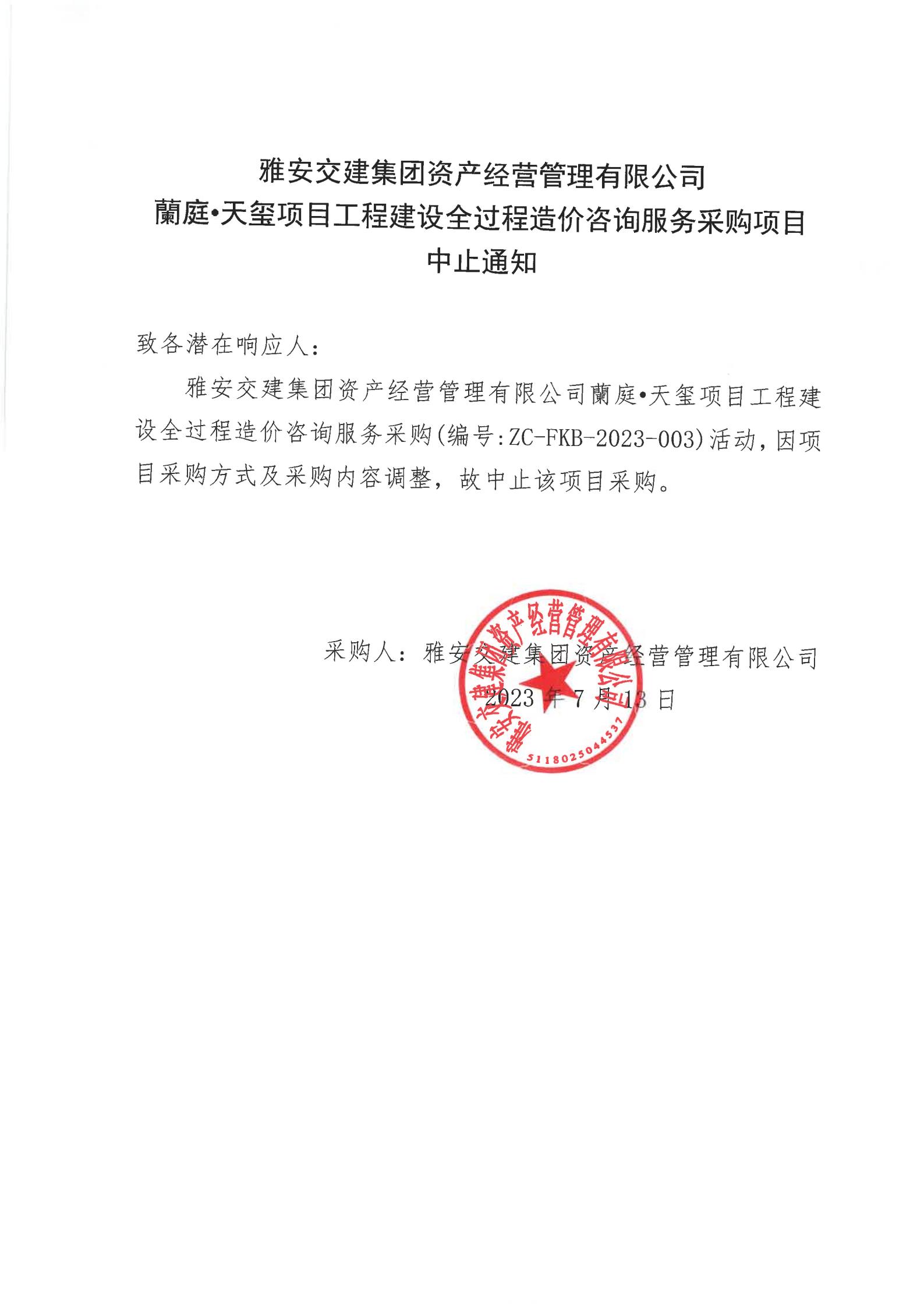 雅安交建集團(tuán)資產(chǎn)經(jīng)營(yíng)管理有限公司蘭庭·天璽項(xiàng)目工程建設(shè)全過(guò)程造價(jià)咨詢(xún)服務(wù)采購(gòu)項(xiàng)目中止通知