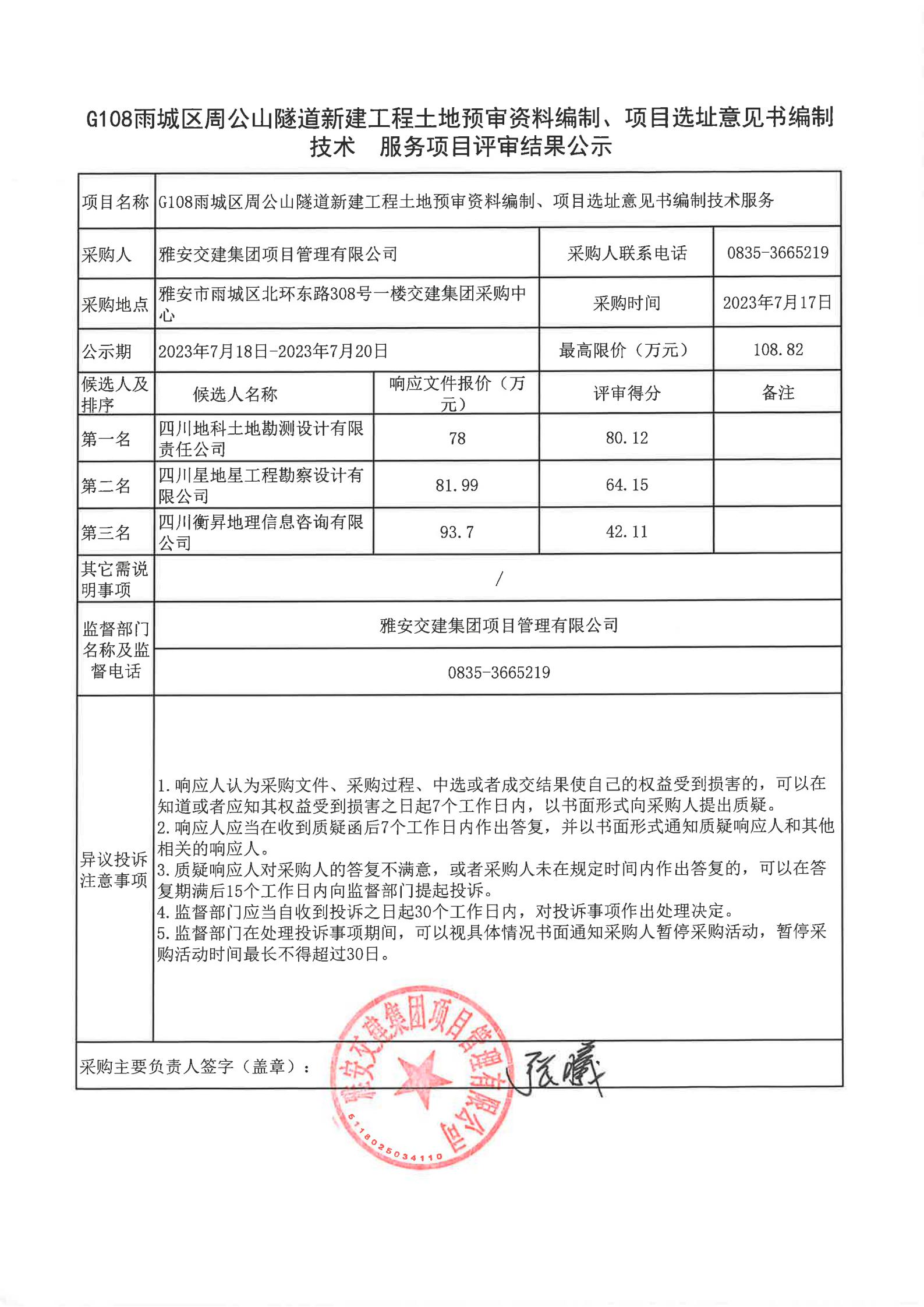 雅安交建集團(tuán)項(xiàng)目管理有限公司G108雨城區(qū)周公山隧道新建工程土地預(yù)審資料編制、項(xiàng)目選址意見書編制技術(shù)服務(wù)項(xiàng)目評(píng)審結(jié)果公示
