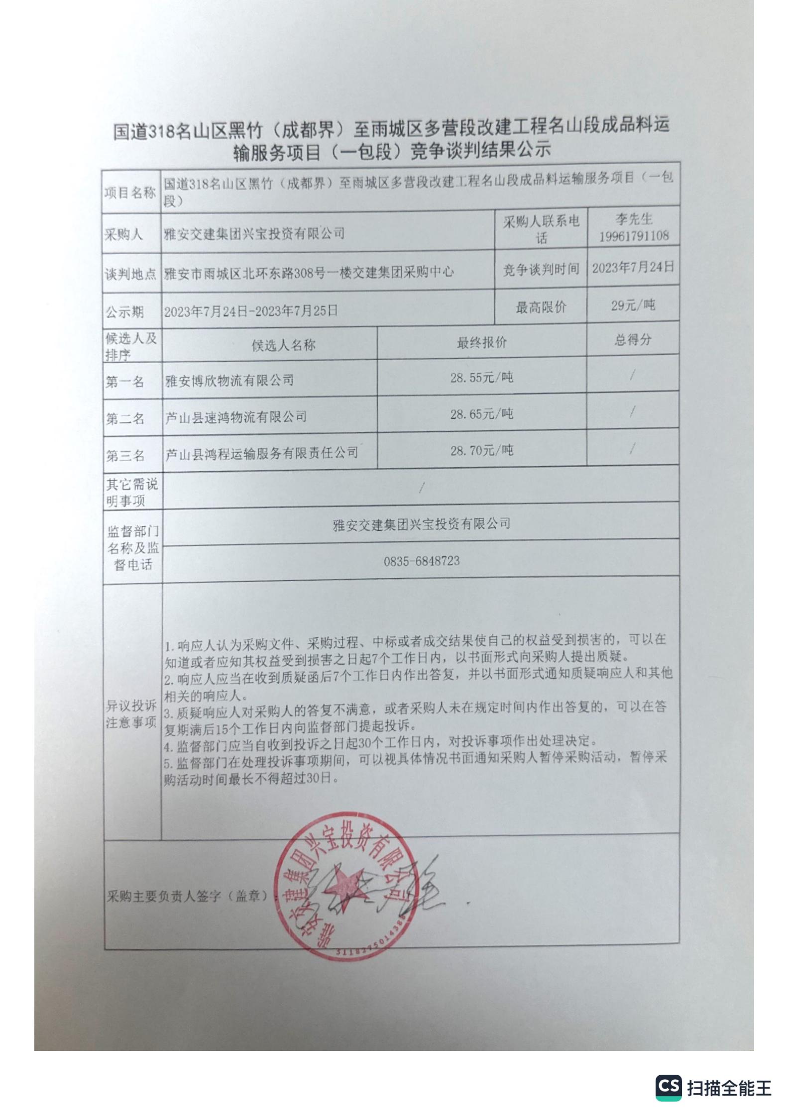 雅安交建集團(tuán)興寶投資有限公司國道318名山區(qū)黑竹(成都界)至雨城區(qū)多營段改建工程名山段成品料運輸服務(wù)項目(二包段)競爭談判結(jié)果公示