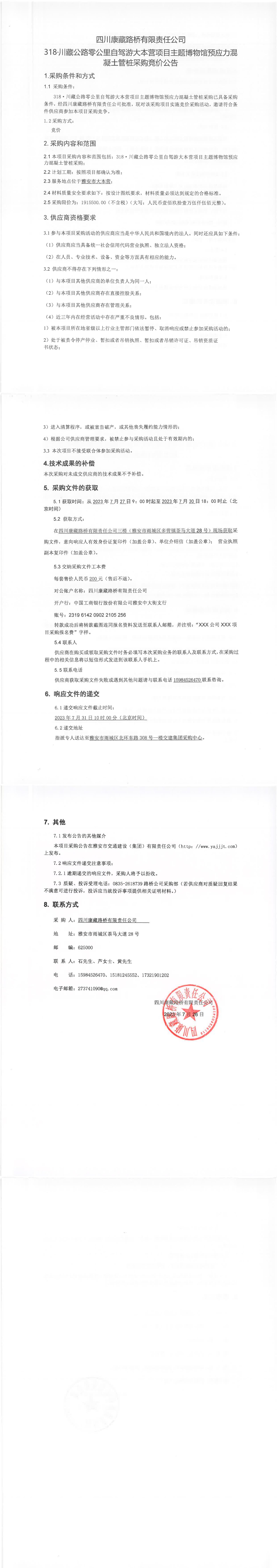 四川康藏路橋有限責(zé)任公司318·川藏公路零公里自駕游大本營項目主題博物館預(yù)應(yīng)力混凝土管樁采購競價公告
