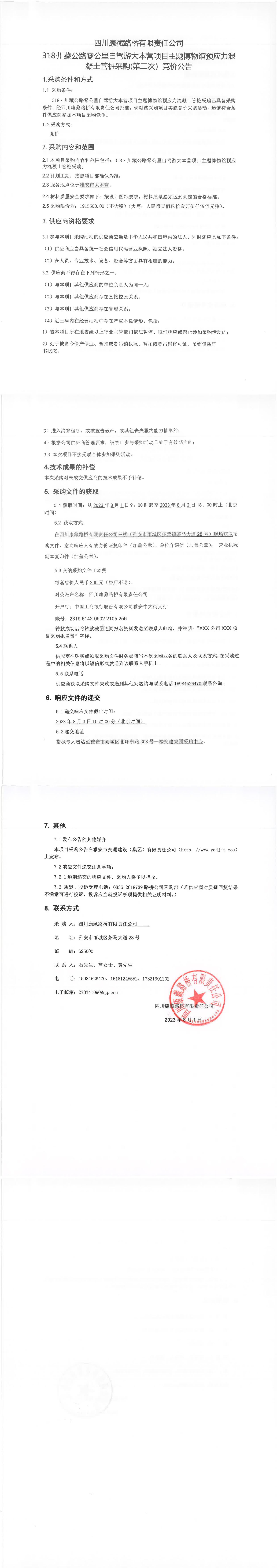 四川康藏路橋有限責任公司318·川藏公路零公里自駕游大本營項目主題博物館預應力混凝土管樁采購(第二次)競價公告