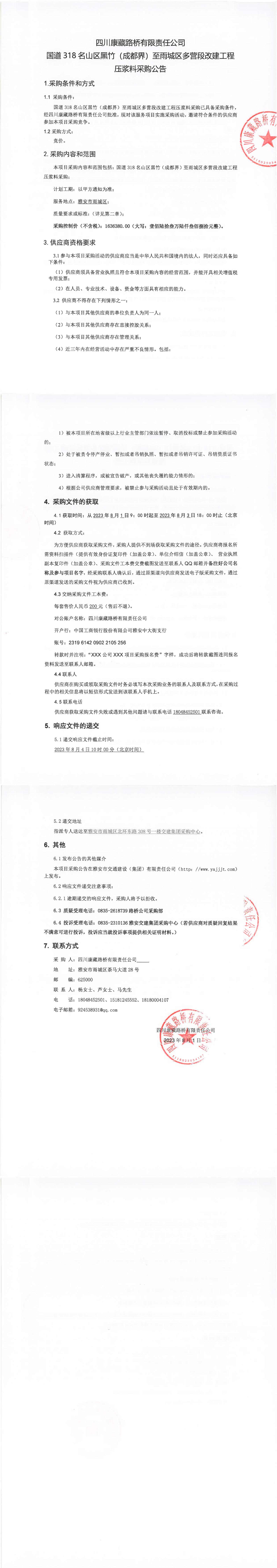 四川康藏路橋有限責(zé)任公司國(guó)道318名山區(qū)黑竹(成都界)至雨城區(qū)多營(yíng)段改建工程壓漿料采購(gòu)公告