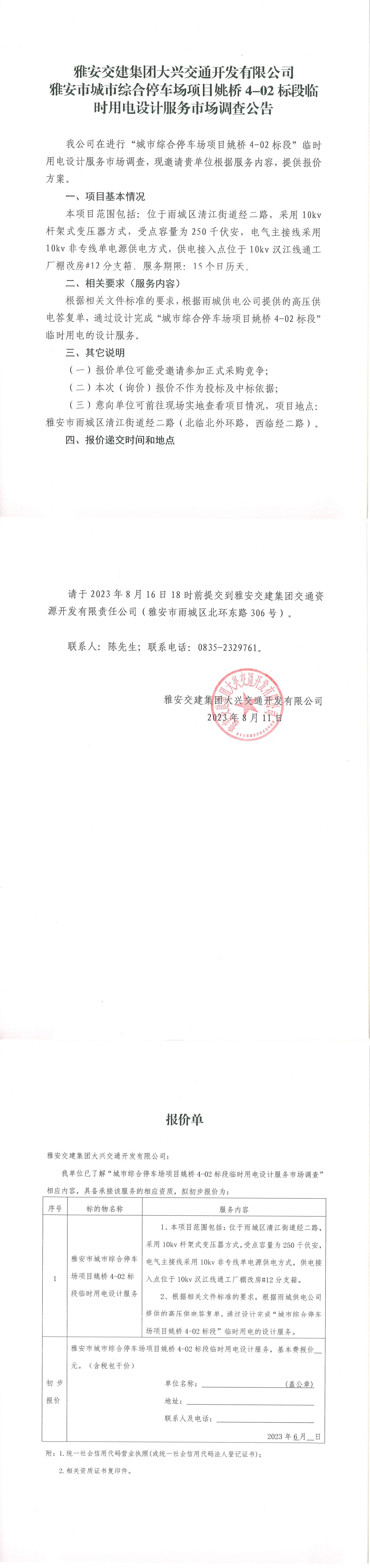 雅安交建集團(tuán)大興交通開發(fā)有限公司雅安市城市綜合停車場(chǎng)項(xiàng)目姚橋4-02標(biāo)段臨時(shí)用電設(shè)計(jì)服務(wù)市場(chǎng)調(diào)查公告