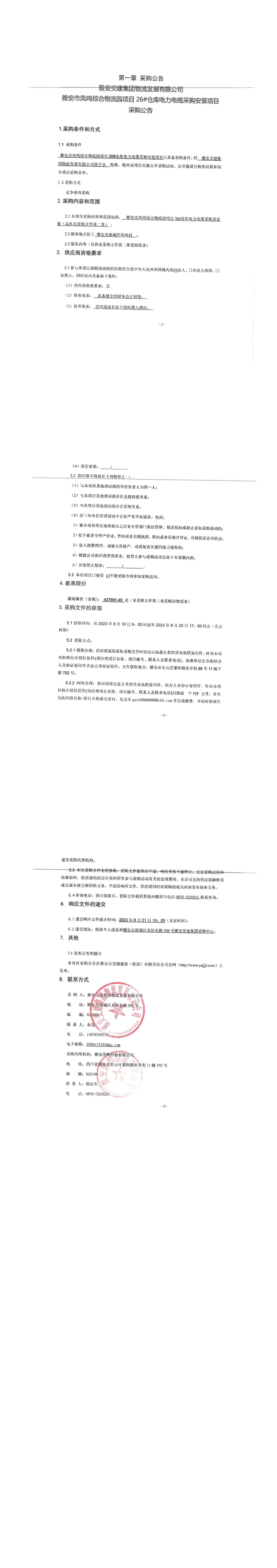 雅安交建集團(tuán)物流發(fā)展有限公司雅安市鳳鳴綜合物流園項目26#倉庫電力電纜采購安裝項目采購公告