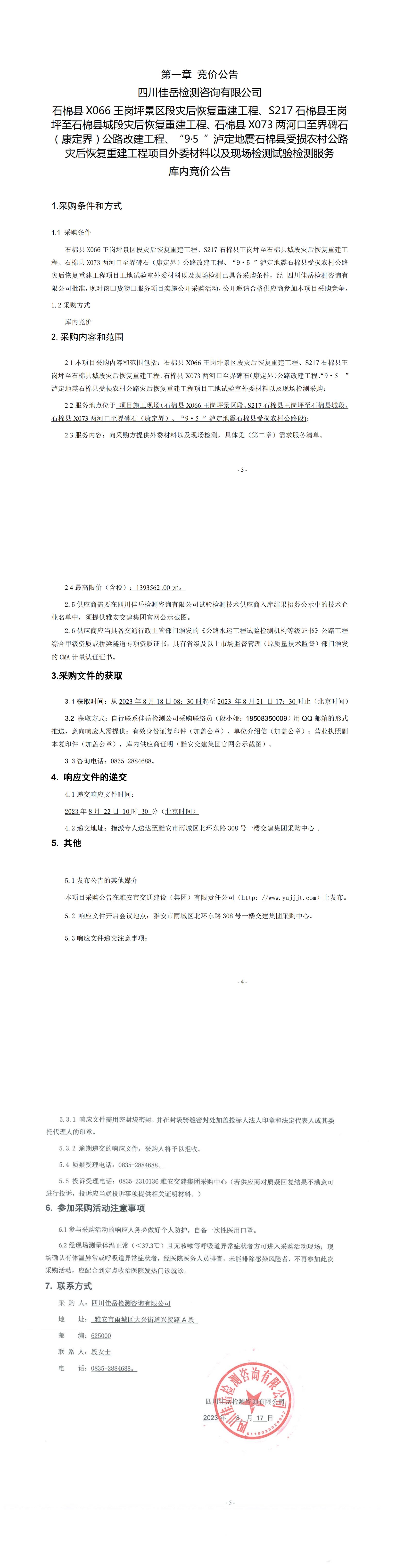四川佳岳檢測咨詢有限公司石棉縣X066王崗坪至王崗坪景區(qū)段災(zāi)后恢復(fù)重建工程、S217石棉縣王崗坪至石棉縣城段災(zāi)后恢復(fù)重建工程、石棉縣X073兩河口至界碑石(康定界)公路改建工程、“9·5”瀘定地震石棉縣受損農(nóng)村公路災(zāi)后恢復(fù)重建工程項(xiàng)目外委材料以及現(xiàn)場檢測試驗(yàn)檢測服務(wù)庫內(nèi)競價公告